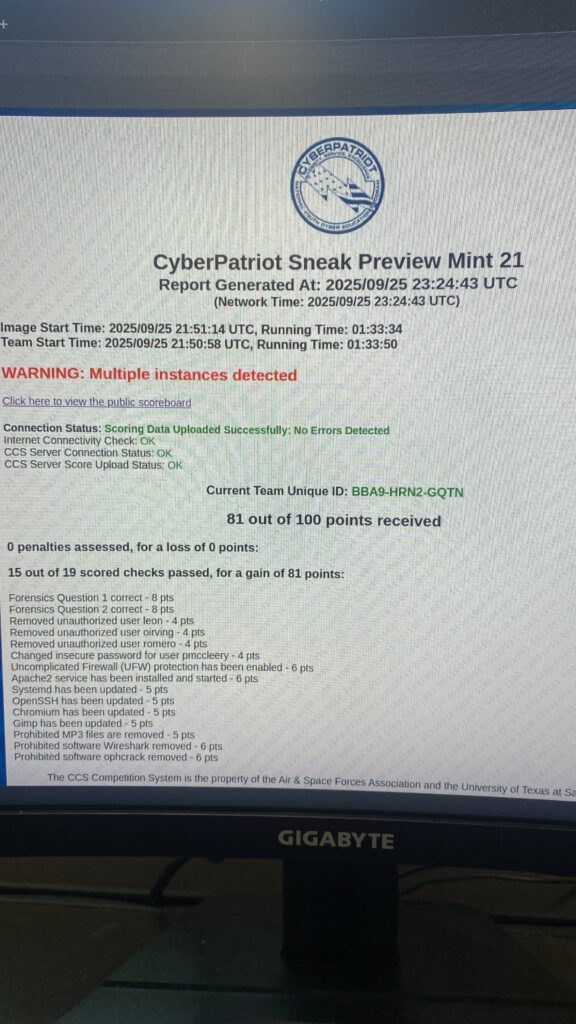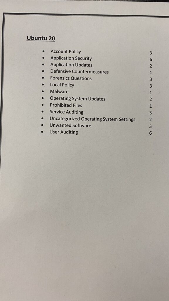 Similar to the actual competition and our practice images, there is also a scoring system here. It scored simple things, such as simply updating apps or deleting files that shouldn’t be there. Which then progresses to harder things like making sure certain users weren’t allowed access to unauthorized directories. A good amount of these tasks were not directly mentioned in the instructions either, only briefly mentioned. The firewall could have been off or there may be hidden software that the company doesn’t know about. So you must be vigilant in the time we will have in our competition and make sure to check everywhere! Start from the simplest tasks and then progress to more complex ones.