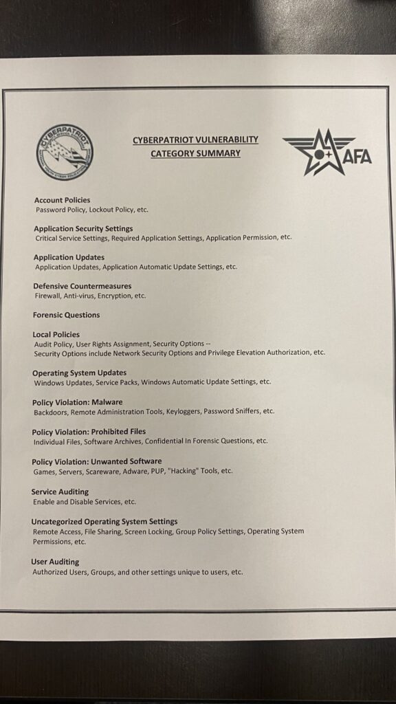 That is all for today’s meeting! It was an important day today and if you missed it make sure to check out Oak Hills Tech for other official Cyber Patriot practice images. We will also be forming teams next week so study lots and be prepared to show a good performance! Competition is soon so be curious and study the topics shown in the lists!